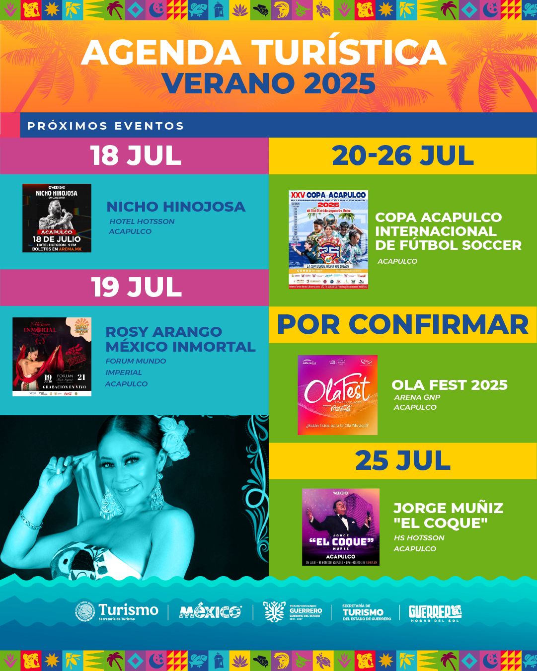 Asimismo, Nicho Hinojosa estará el 18 de julio en el Hotel HS Hotsson de Acapulco; Rosy Arango el 19 de julio en Fórum Mundo Imperial de Acapulco; la Copa Acapulco Internacional de Fútbol Soccer del 20 al 26 de julio; Jorge Muñiz “El Coque” el 25 de julio en HS Hotsson Acapulco.