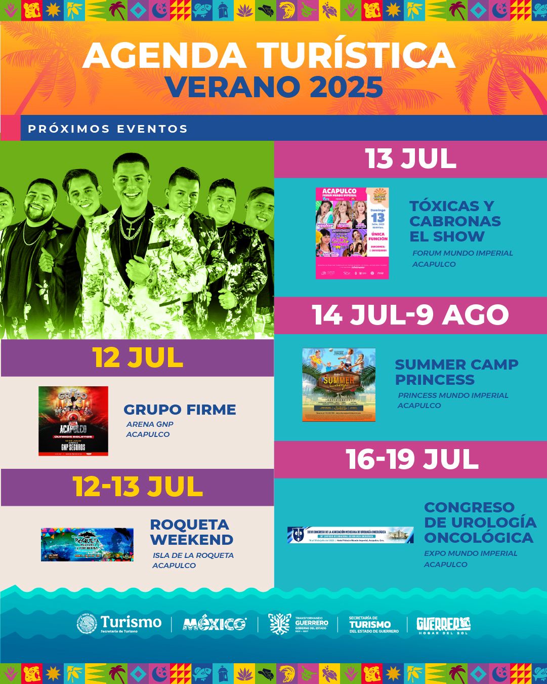 Tóxicas y Cabronas, El Show se presentará el 13 de julio en Acapulco; Summer Camp Princess del 14 de julio al 9 de agosto en Acapulco; el Congreso de Urología Oncológica del 16 al 19 de julio en Acapulco.