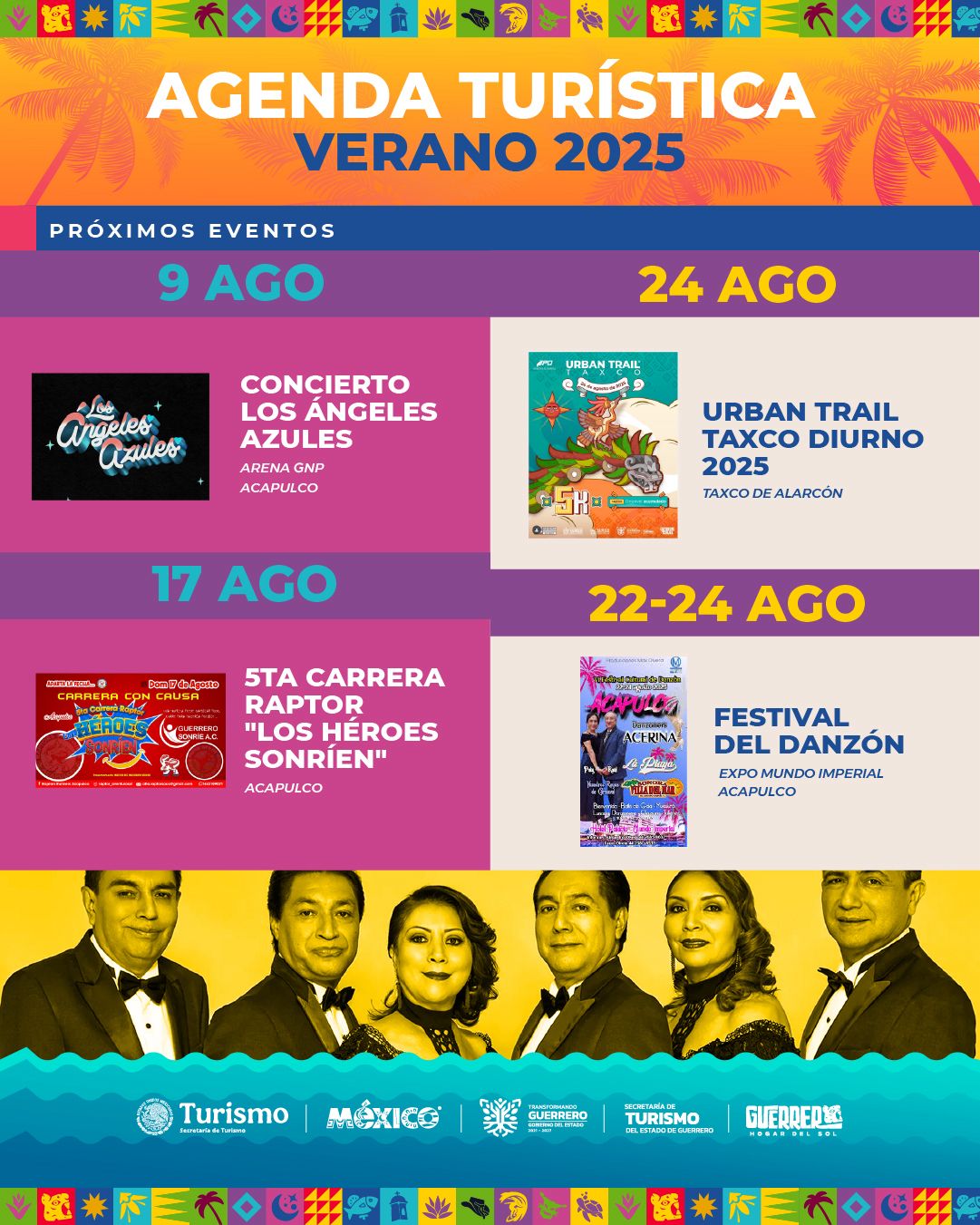 También el Show de Lucha Libre el 2 de agosto en Arena GNP Acapulco; Concierto de Los Ángeles Azules el 9 de agosto en la Arena GNP; la 5ta Carrera Raptor “Los Héroes Sonríen” el 17 de agosto en Acapulco; el Festival del Danzón del 22 al 24 de agosto en Expo Mundo Imperial, y Urban Trail Taxco Diurno 2025 el 24 de agosto en Taxco de Alarcón.