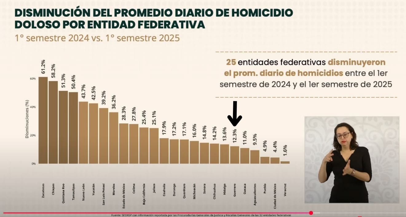 Chilpancingo, Gro., 8 de julio de 2025.- Durante la conferencia matutina encabezada por la presidenta Claudia Sheinbaum Pardo, se dio a conocer que Guerrero se encuentra entre las 25 entidades del país que lograron reducir la incidencia de homicidios dolosos durante el primer semestre de este año, en comparación con el mismo periodo de 2024.