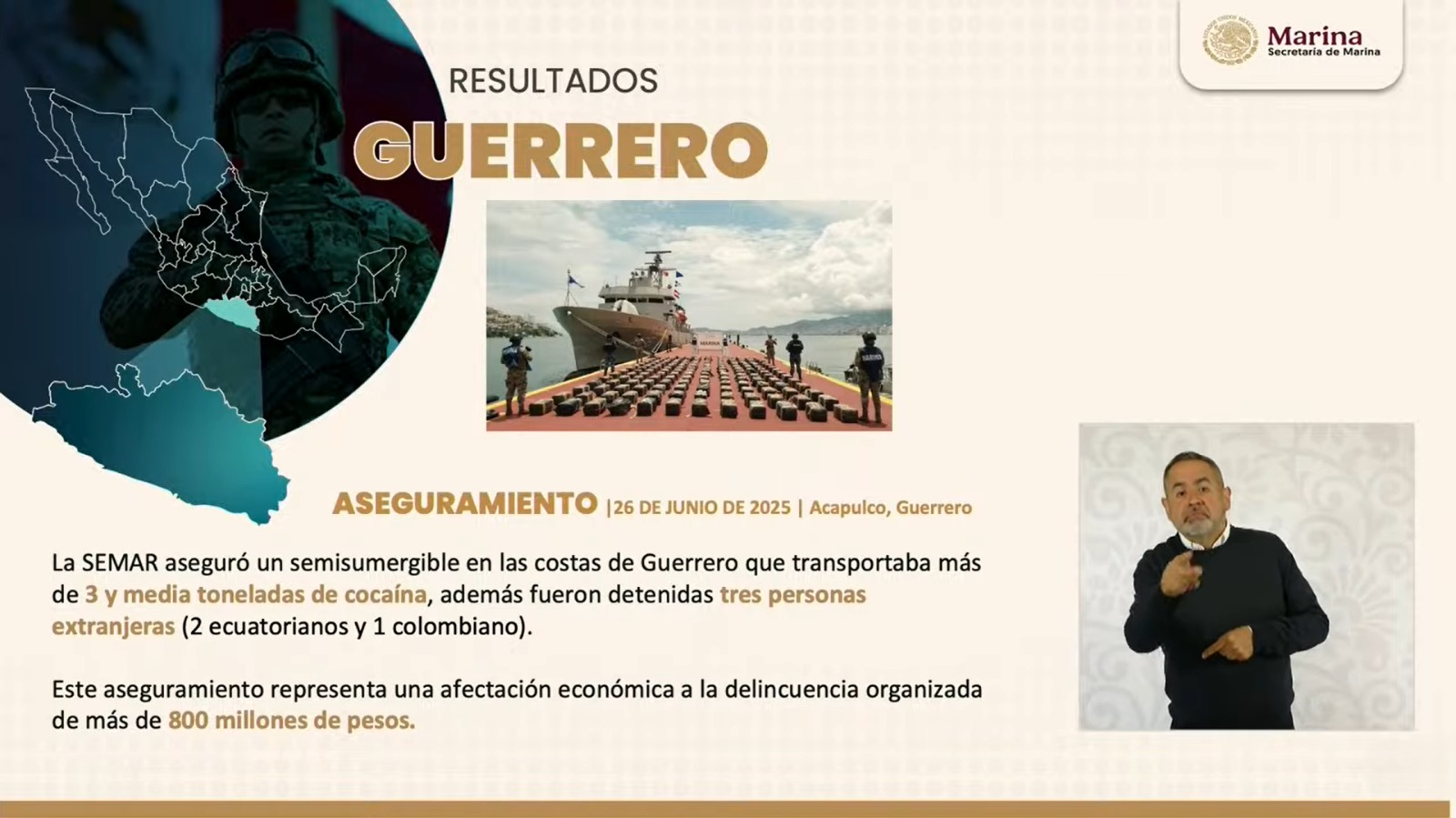 Como parte de estas acciones de seguridad, el Secretario de Seguridad y Protección Ciudadana, Omar García Harfuch, informó que, en las costas de Guerrero, la Secretaría de Marina aseguró un semisumergible que transportaba tres toneladas y media de cocaína, con un valor estimado en más de 800 millones de pesos. Este golpe al crimen organizado se suma a los decomisos acumulados de más de 44 toneladas de droga en altamar.