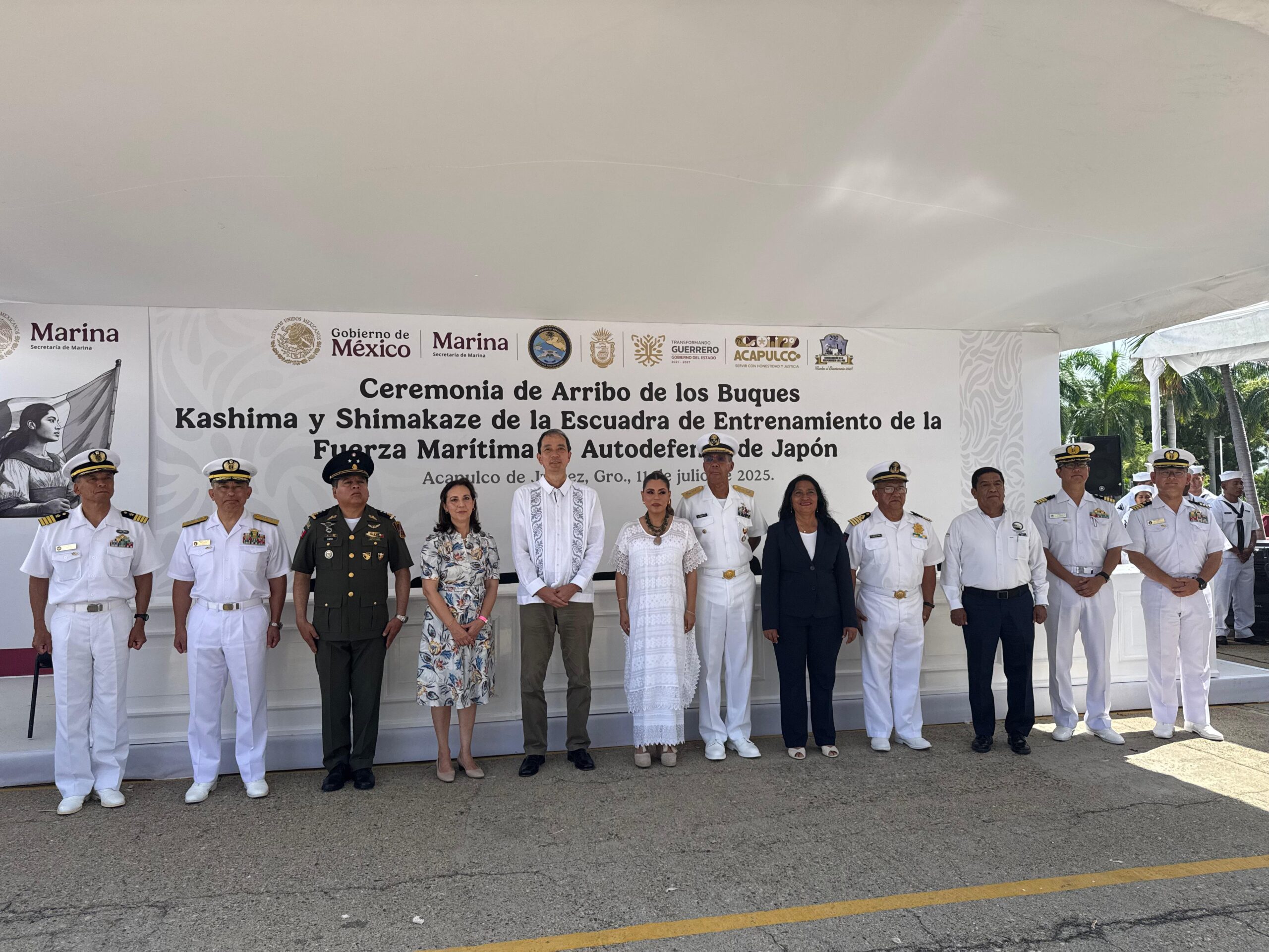 Acapulco, Gro., 11 de julio de 2025.- La Presidenta Municipal, Abelina López Rodríguez, participó en la ceremonia de arribo de la Escuadra de Entrenamiento de la Fuerza Marítima de Autodefensa de Japón, evento que refleja el fortalecimiento de la relación bilateral y el reconocimiento del valor histórico de Acapulco como puente cultural.