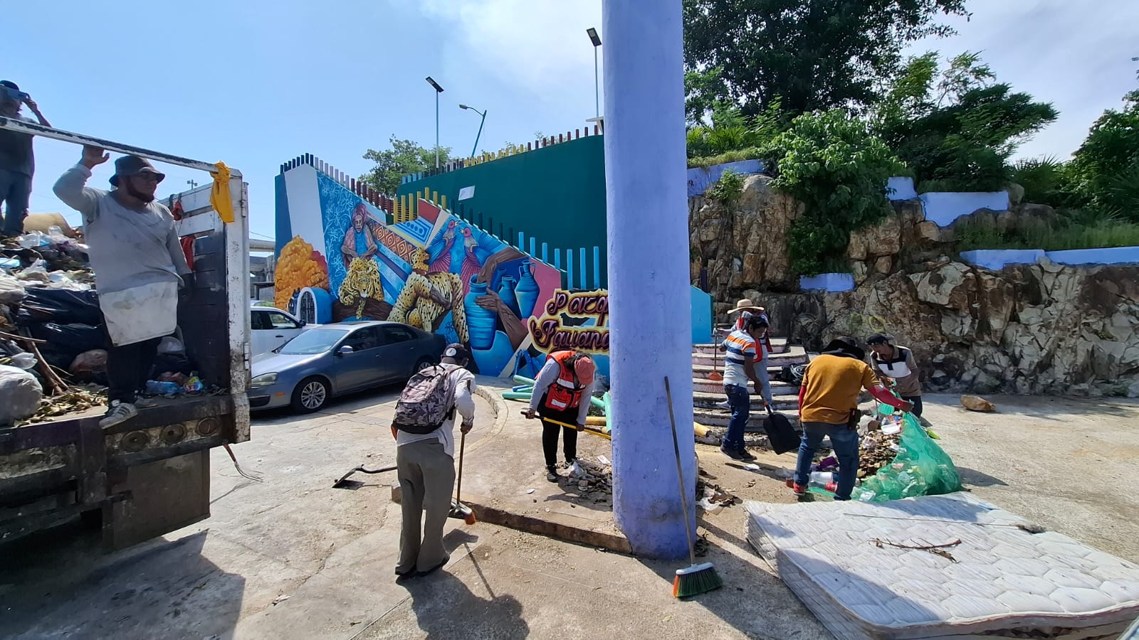 Durante la jornada de intervención se efectuaron labores como poda de árboles, retiro de maleza en jardineras, recolección de basura y barrido grueso, además del desmontaje de mobiliario dañado y otras tareas orientadas a embellecer este sitio que representa un punto importante de convivencia para quienes habitan y transitan por el Centro de Acapulco.