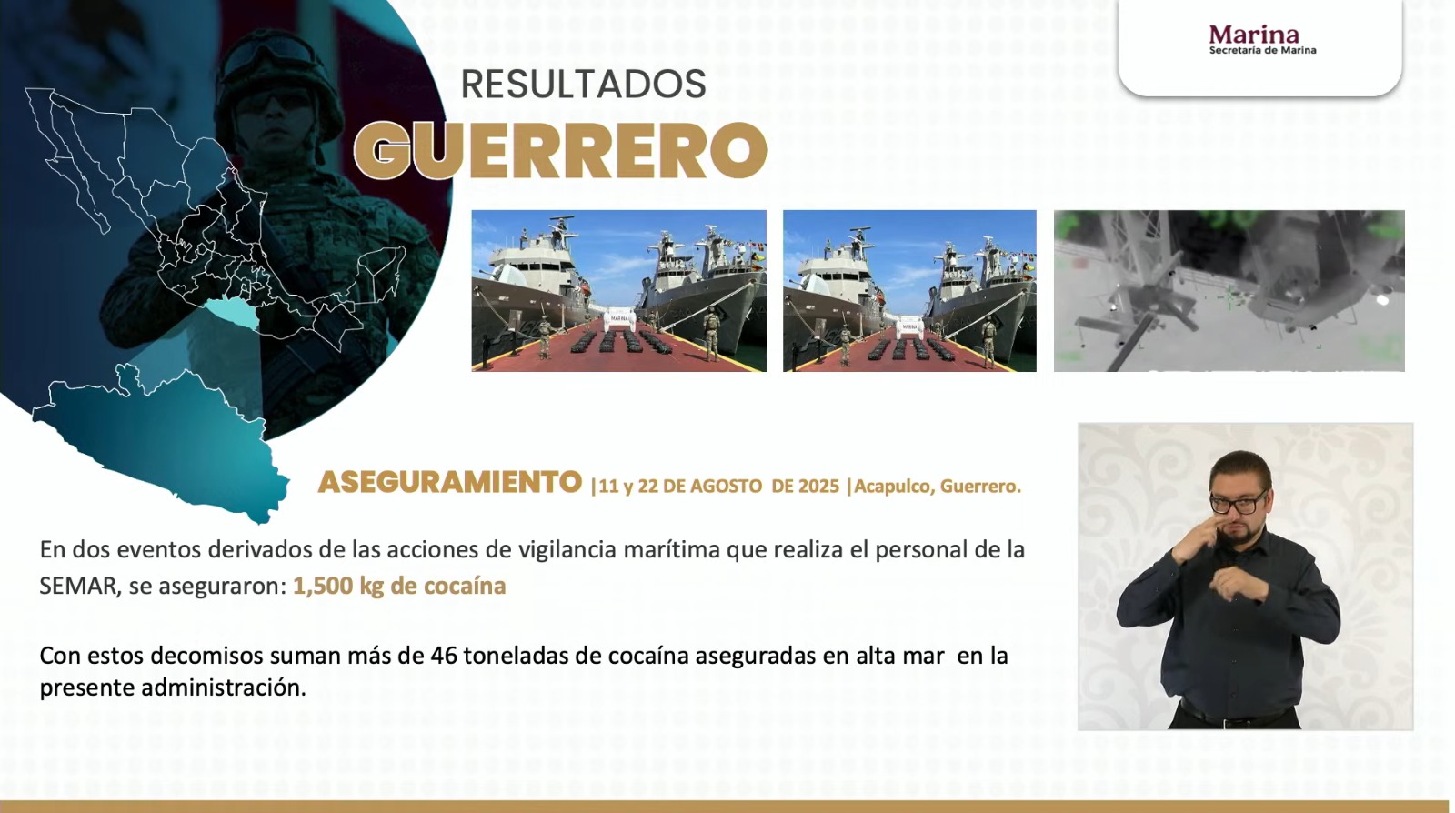 Asimismo, destacó que personal de la Marina, en dos acciones de vigilancia marítima, aseguró en Acapulco mil 500 kilos de cocaína, con lo que suman un total de 47 toneladas incautadas en alta mar durante la presente administración, un hecho que representa un duro golpe a las estructuras del narcotráfico.