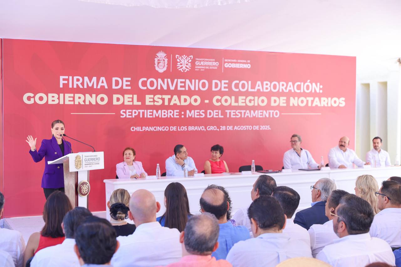 Chilpancingo, Gro., 28 de agosto de 2025. – Con el objetivo de garantizar justicia social, certeza jurídica y tranquilidad a las familias guerrerenses, la gobernadora Evelyn Salgado Pineda y el Colegio de Notarios del Estado de Guerrero, firmaron un convenio de colaboración que establece beneficios y tarifas especiales para adultos mayores durante septiembre, mes del testamento.