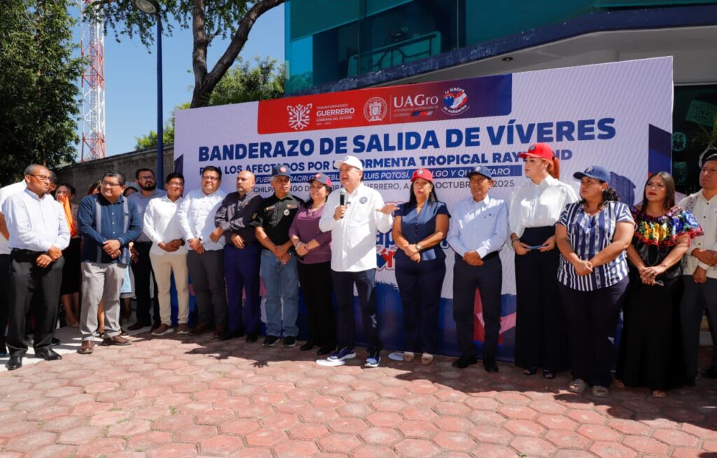 Chilpancingo, Gro., 29 de octubre de 2025.- El rector de la Universidad Autónoma de Guerrero (UAGro), Javier Saldaña Almazán, acompañado del Secretario de Gestión de Riesgos y Protección Civil del Gobierno del Estado, Roberto Arroyo Matus, funcionarios, directores y estudiantes dio el banderazo de salida a 40 toneladas de víveres enviados principalmente al estado de Veracruz, para ayudar a las familias damnificadas tras el paso de la Tormenta “Raymond”.