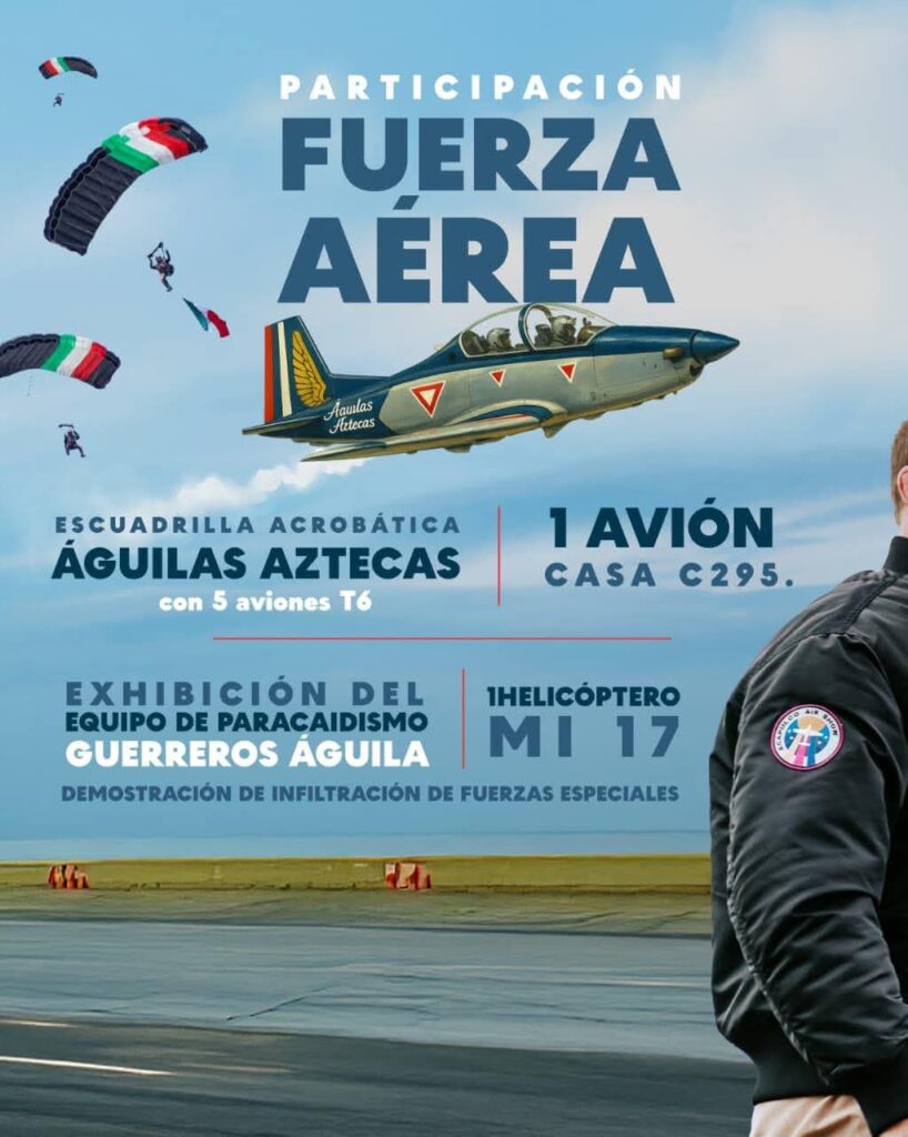 Como parte de los preparativos, destacó la participación de la Fuerza Aérea Mexicana, que arribará con la Escuadrilla Acrobática Águilas Aztecas, integrada por 5 aviones T6, además de un avión CASA C295, el equipo de paracaidismo Guerreros Águila, un helicóptero MI-17 y la demostración de infiltración de Fuerzas Especiales, acciones que aseguran un espectáculo de primer nivel.
