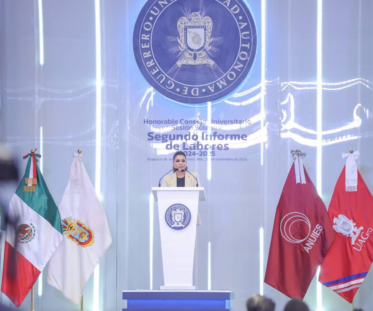 Acapulco, Gro., 28 de noviembre de 2025.- Al asistir como invitada al Segundo Informe de Labores del rector de la Universidad Autónoma de Guerrero (UAGro), Javier Saldaña Almazán, la gobernadora Evelyn Salgado Pineda, refrendó su compromiso para continuar trabajando de la mano con la máxima casa de estudios, priorizando el apoyo a la educación e impulsando el desarrollo de la entidad.