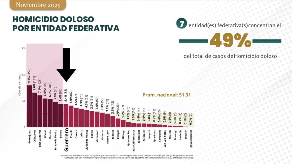 De acuerdo con el reporte del SESNSP, de enero a noviembre de 2025 Guerrero registró 1,240 homicidios dolosos, lo que representa el 5.7 % del total nacional. Con esta cifra, la entidad se ubica en el sexto lugar a nivel nacional.