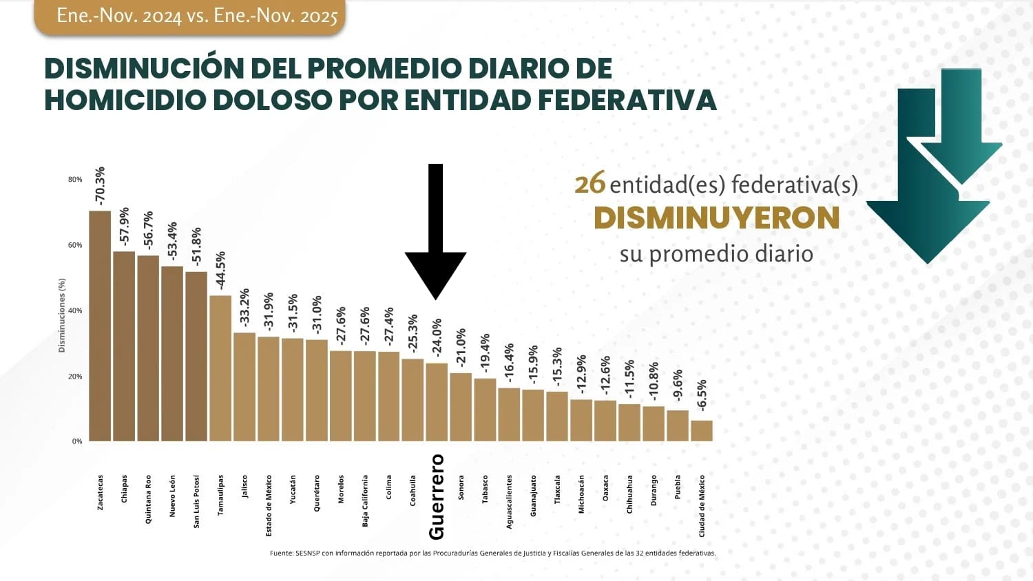 Figueroa Franco destacó que 26 estados del país presentan disminución en el promedio diario de homicidios dolosos, entre ellos Guerrero, que muestra una caída del 24 %. En esta categoría, la entidad ocupa el lugar 15 entre los 26 estados con descensos.