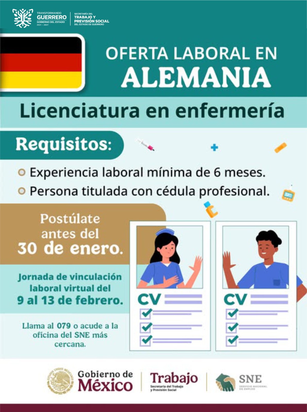 Chilpancingo, Gro., 11 de enero de 2026.– El gobierno del Estado que encabeza la gobernadora Evelyn Salgado Pineda, continúa realizando acciones que sumen a la estabilidad social y económica de la entidad, por lo cual a través de la Secretaría del Trabajo y Previsión Social (STyPS) de Guerrero, y en coordinación con el Servicio Nacional de Empleo (SNE), se abrió un proceso de reclutamiento dirigido a enfermeras y enfermeros para laborar en un hospital de Alemania, enfocado en la atención integral y holística de pacientes de todas las edades.