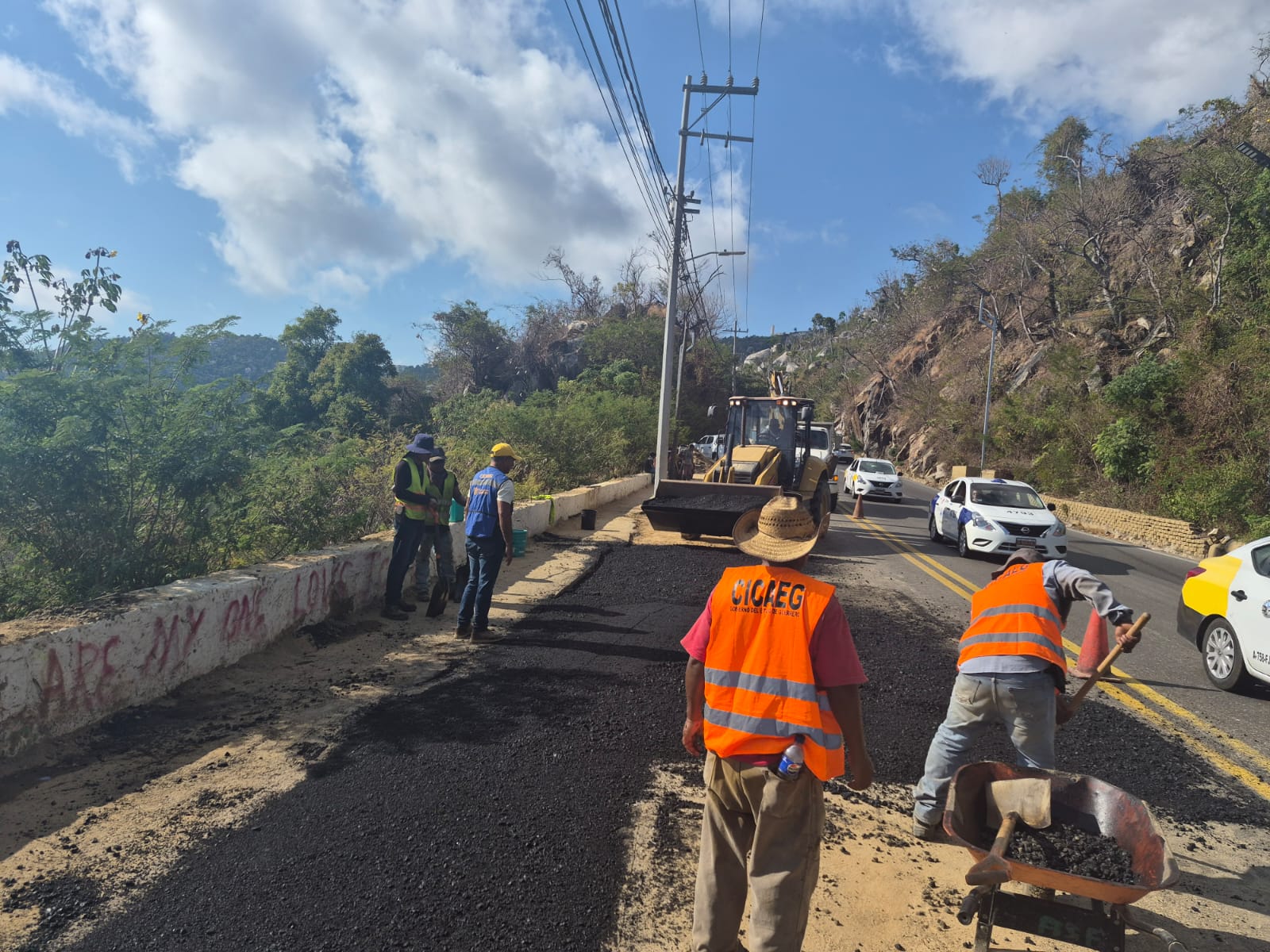 Acapulco, Gro., 26 de Enero de 2026.- Luego de concluir los trabajos de reparación de una fuga de agua en la avenida Escénica de Acapulco, la Comisión de Infraestructura Carretera y Aeroportuaria del Estado de Guerrero (CICAEG) lleva a cabo labores de rehabilitación de la carpeta asfáltica en la zona intervenida.