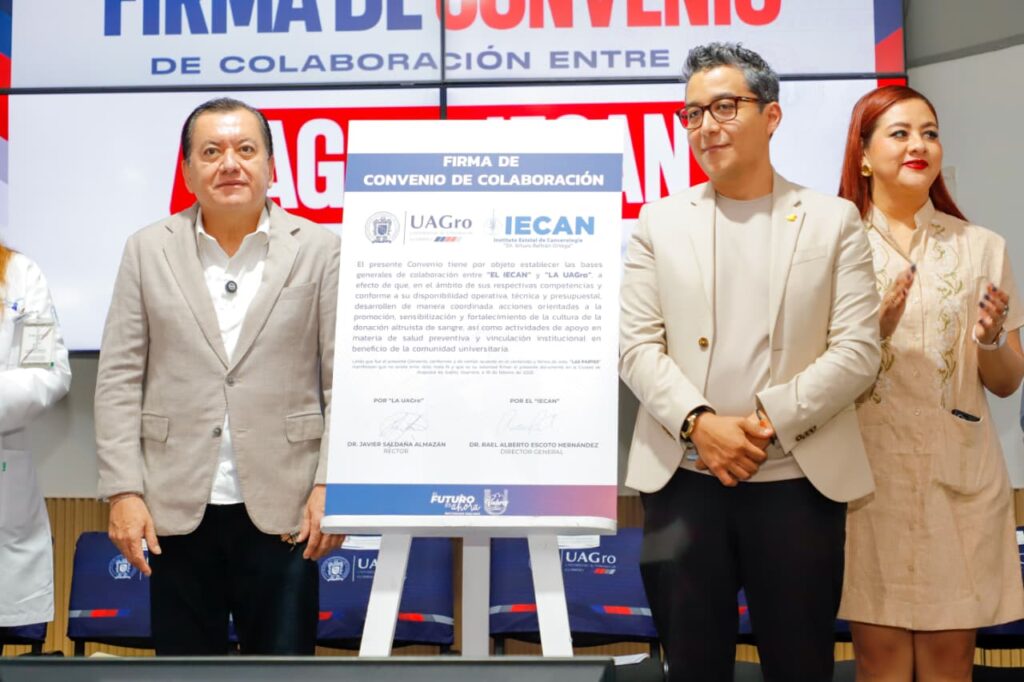 Acapulco, Gro., 18 de febrero de 2026.- El rector de la Universidad Autónoma de Guerrero (UAGro), Javier Saldaña Almazán, firmó un convenio de colaboración con el director general del Instituto Estatal de Cancerología (IECAN), Rafael Escoto Hernández. El objetivo es fortalecer la formación académica de estudiantes del área de la salud y desarrollar acciones conjuntas en beneficio de la población guerrerense.