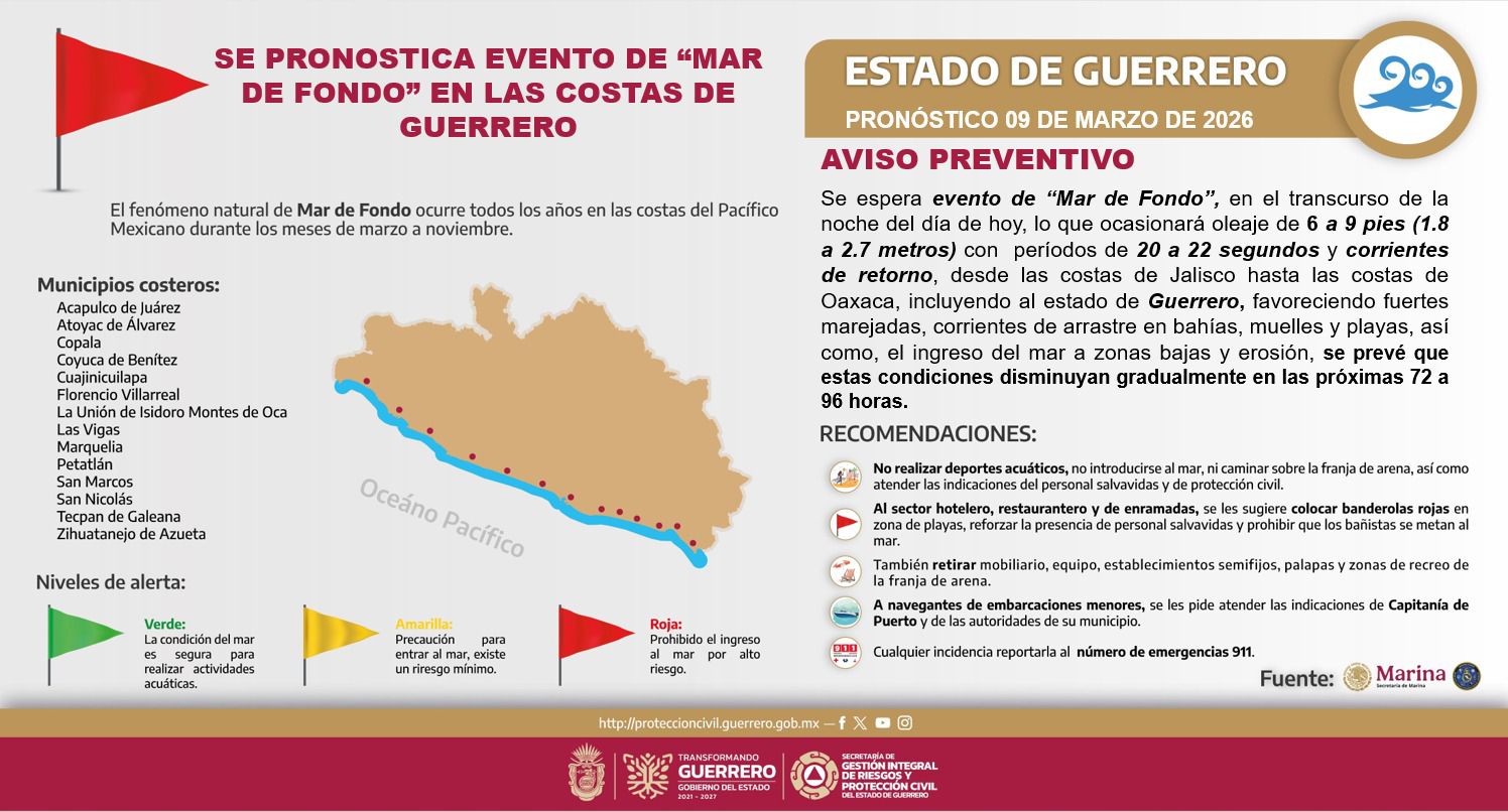 Chilpancingo, Gro., 09 de marzo de 2026.- La Secretaría de Gestión Integral de Riesgos y Protección Civil del Estado de Guerrero informa que se pronostica un evento de Mar de Fondo durante la noche de este día en las costas del estado.